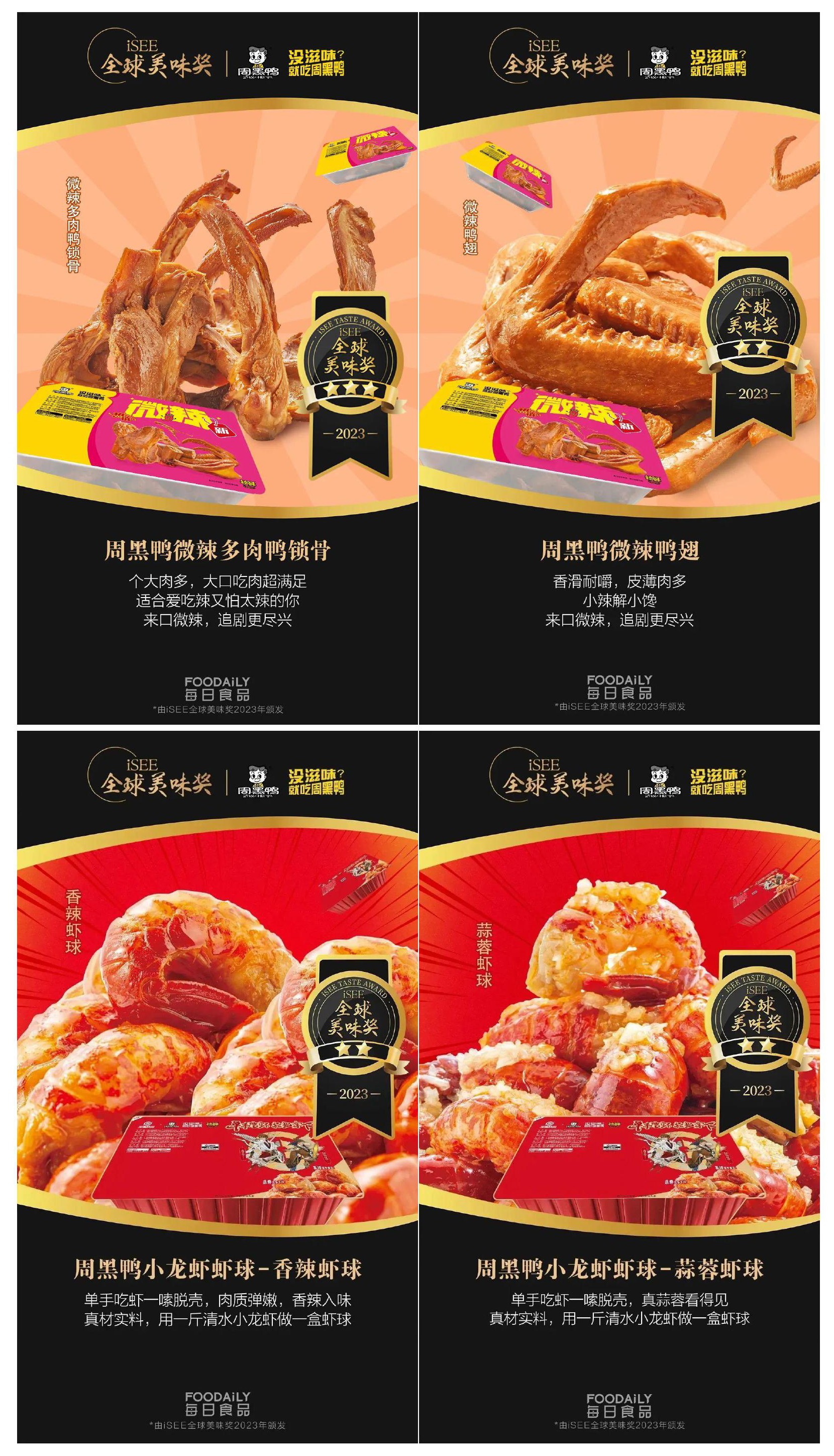 不僅如此,【微辣多肉鴨鎖骨】榮獲「iSEE☆☆☆全球美味獎」,【微辣鴨翅】【小龍蝦蝦球-香辣蝦球】【小龍蝦蝦球-蒜蓉蝦球】榮獲「iSEE☆☆全球美味獎」,【周黑鴨小龍蝦蝦球】【周黑鴨微辣口味產品】榮獲「iSEE全球食品創新百強榜」。共計7項“iSEE”全球獎!